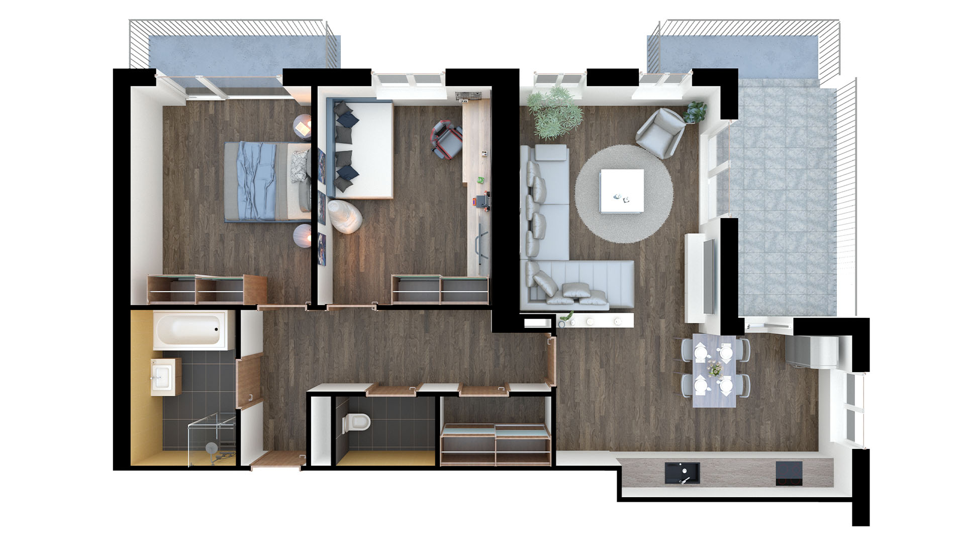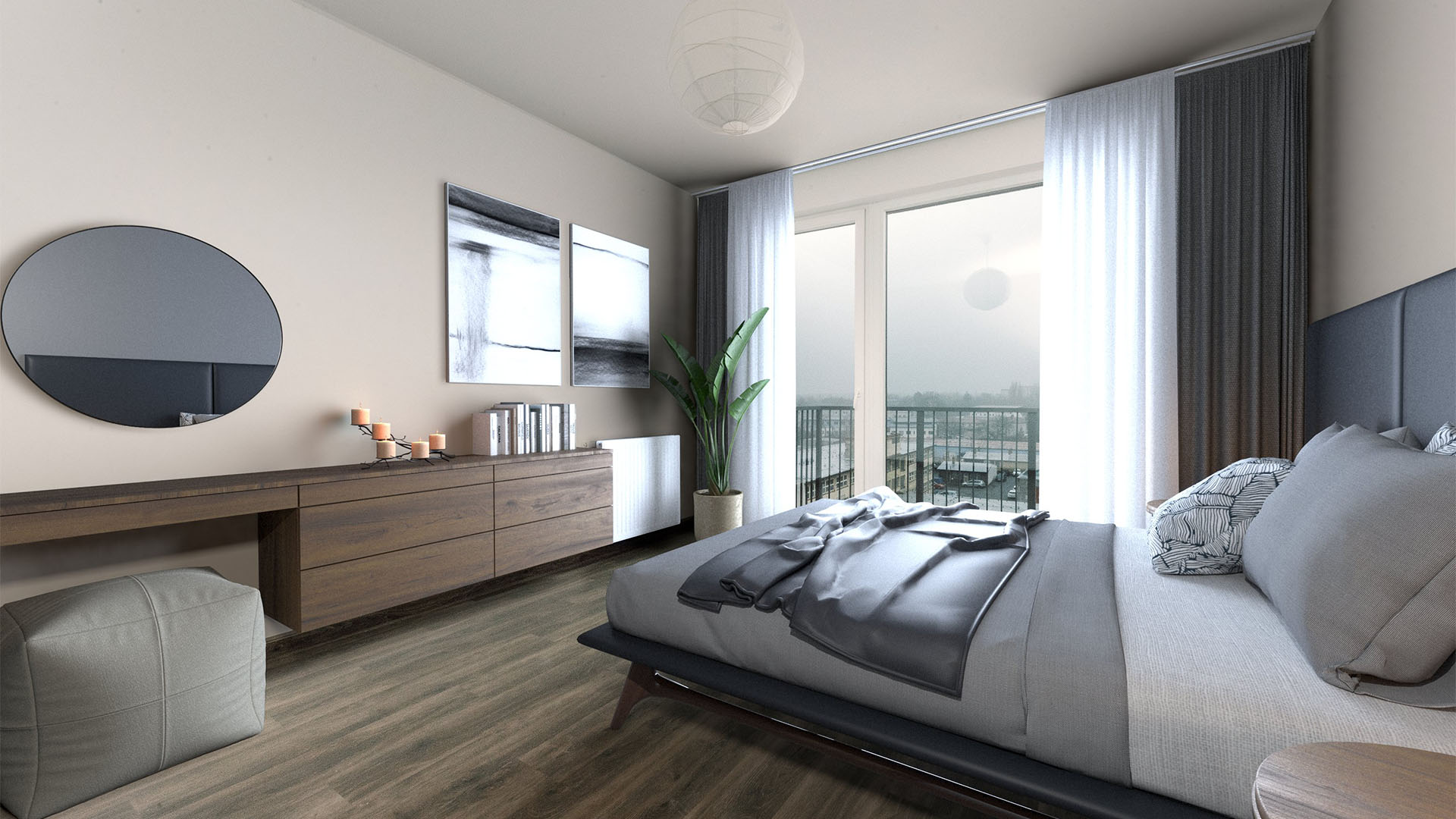 Mimořádný klid a dostatek prostoru vám poskytne tento byt umístěný v posledním 6. patře projektu Residence Na Spravedlnosti. Nemovitost vyniká velkorysým prostorem, výbornou orientací a naprostým soukromím. Hlavní obytný prostor, obývací pokoj s kuchyňským koutem o velikosti 37 m2 je orientován na jihovýchod. Díky tomu je po celý den krásně prosvětlený a působí velmi příjemným dojmem. Velkorysá dispozice zajišťuje variabilitu interiéru. Nacházíme se v nejvyšším podlaží a nad námi tedy nikdo nebydlí, což zajišťuje zmiňované soukromí. Výhled z bytu není orientován do vnitrobloku, takže vás neruší pohled do oken jiných bytů. Prostorná terasa, též orientovaná na jihovýchod je přístupná z obývacího pokoje. Obě ložnice směřují na východ a jsou prosvětlené již od rána. Hlavní ložnice se vstupem na balkon nabídne 15,5 m2, druhá pak 14,7 m2.